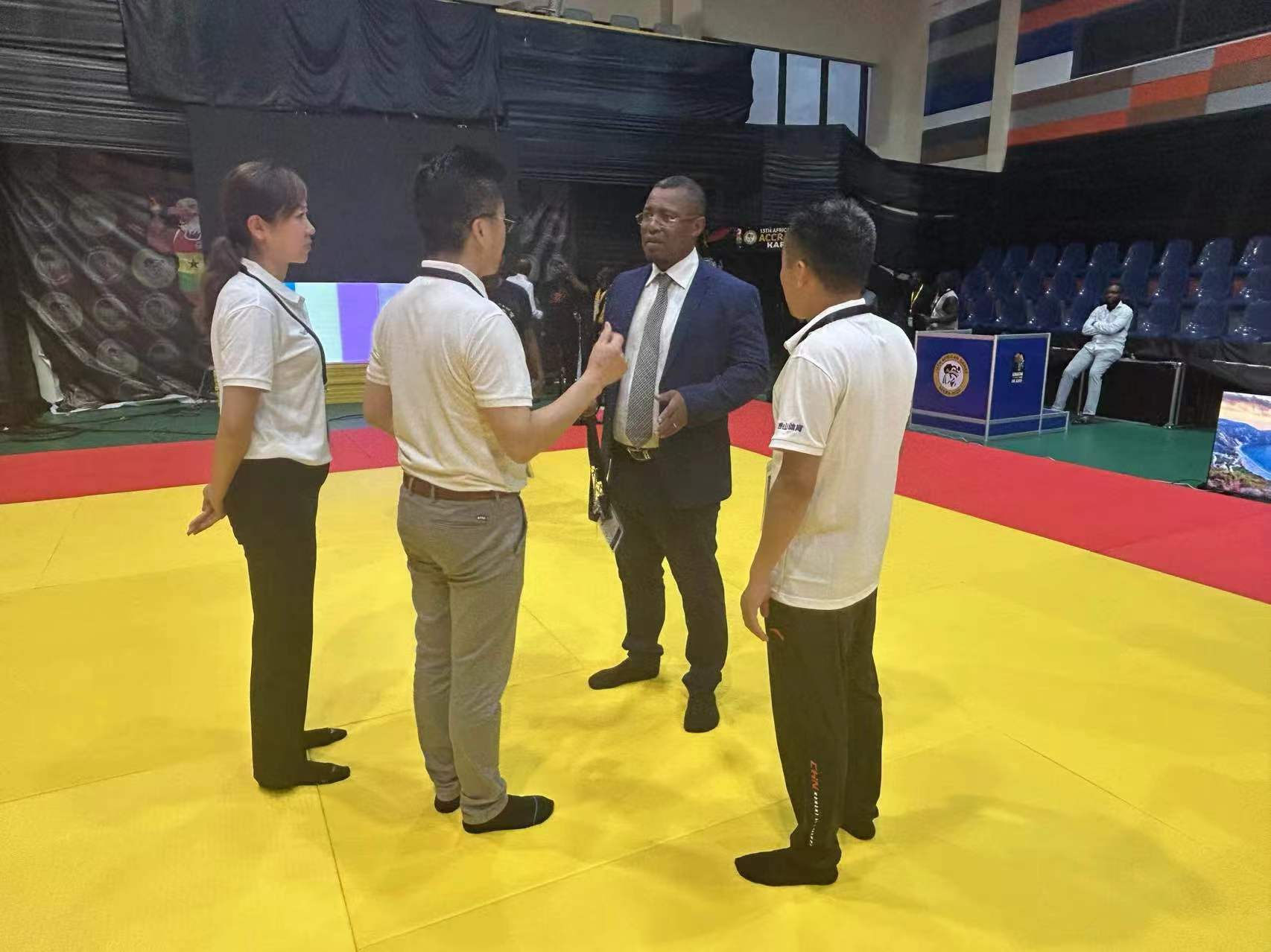 △ 保障团队和非洲柔道联盟主席Siteny Randrianasolo在leyu乐鱼体育体育器材上
