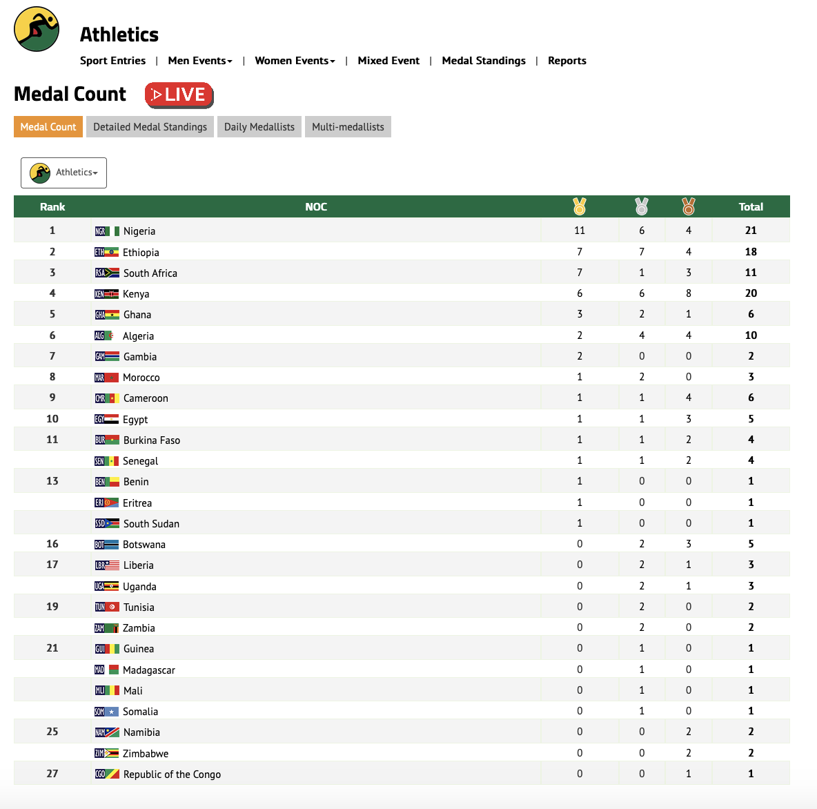 近日,非洲运动会田径赛事精彩纷呈,经过3月18日至22日的激烈角逐,田径比赛共产生46枚金牌,尼日利亚位居金牌榜榜首,共取得11枚金牌。埃塞俄比亚和南非分别获得7枚金牌并列金牌榜第二名。